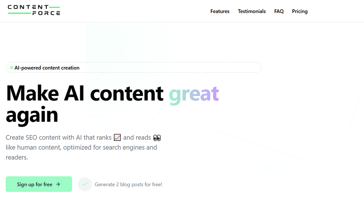 ContentForce AI is an AI-driven content creation tool that generates SEO-optimized blog posts designed to read like human-written articles. It offers features such as automated outline generation, research, and integration with WordPress, supporting newest AI models like GPT 5.1 and Claude 4.5 Sonnet.