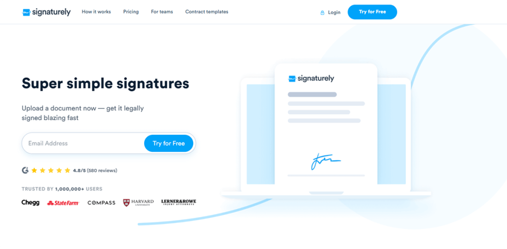 Signaturely is an electronic signature platform that simplifies the online signing and management of documents. It offers customisable templates, automated reminders and integration with popular cloud storage services such as Google Drive, OneDrive, Dropbox and Box. Affordable and user-friendly, Signaturely is one of the best alternatives to DocuSign.