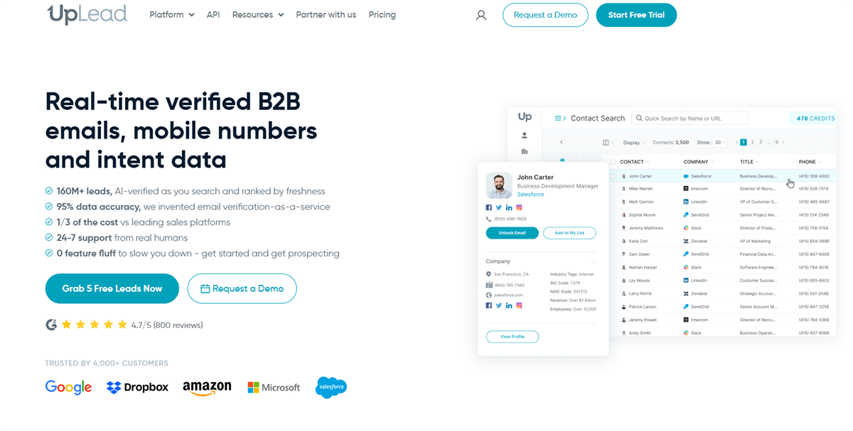 UpLead is a B2B data provider designed for teams that prioritize data accuracy over database size. With access to 160 million verified business contacts, UpLead provides real-time email verification before downloads and guarantees 95% data accuracy, all at a fraction of the cost of enterprise platforms. This makes UpLead one of the best competitors to ZoomInfo.