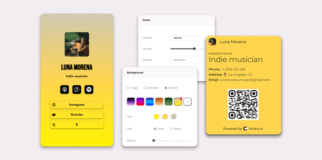 With Wisery, you can create a digital business card that actually works for you: flexible, updatable, and ready in the format you need, whether PDF, image, or Google/Apple Wallet. Make your connections easier, track engagement, and keep your information current — all in one place.